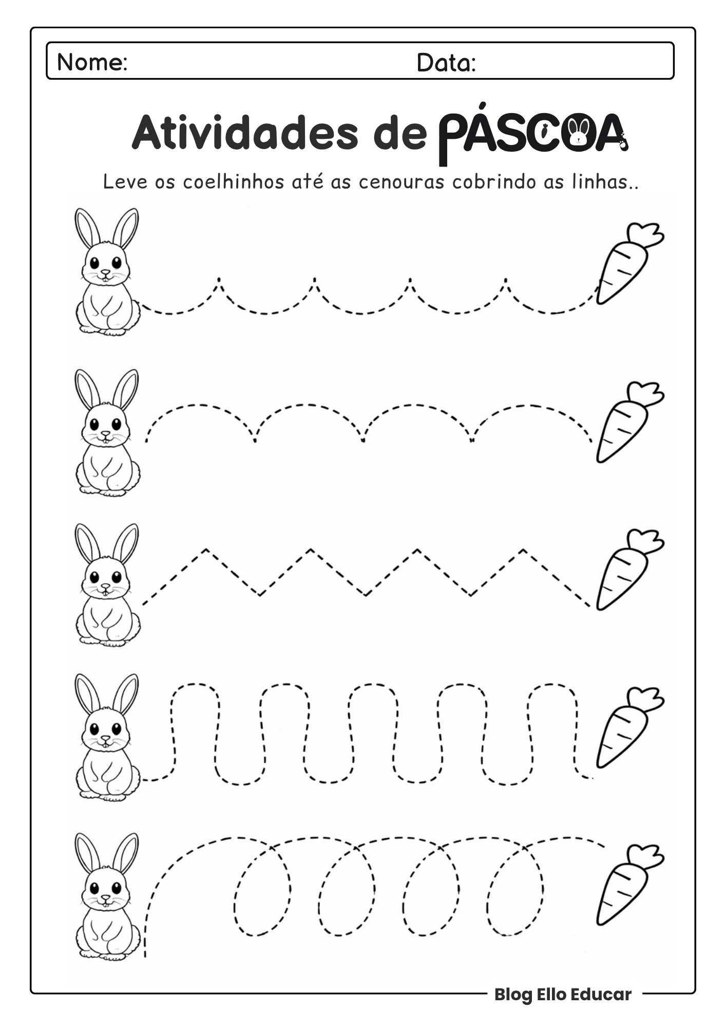 • Atividades: Exercícios de cobrir pontilhados com diferentes traçados (retos, curvos, em ondas e espirais), como os caminhos que levam o coelhinho até a cenoura (páginas 2 a 7 ).