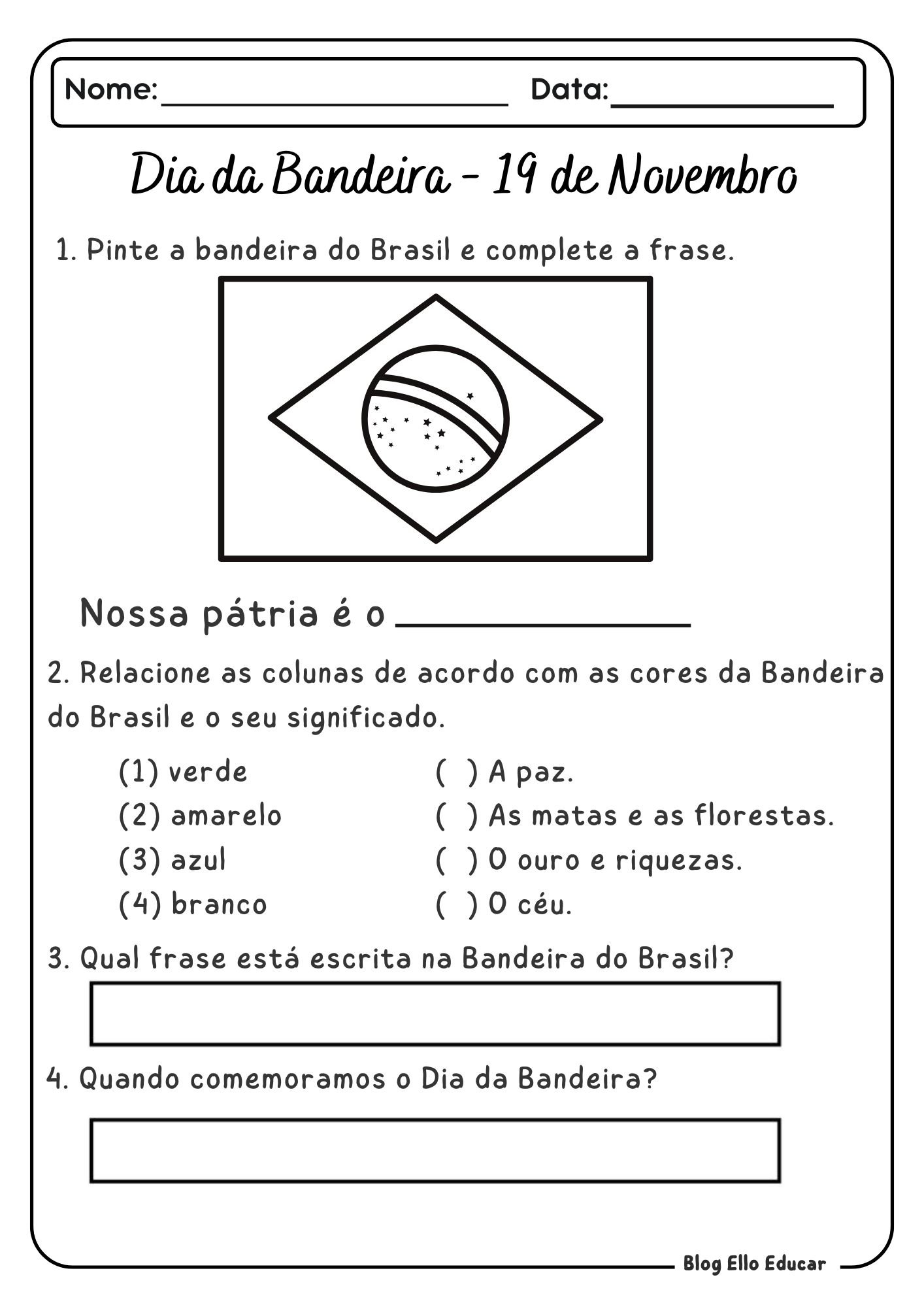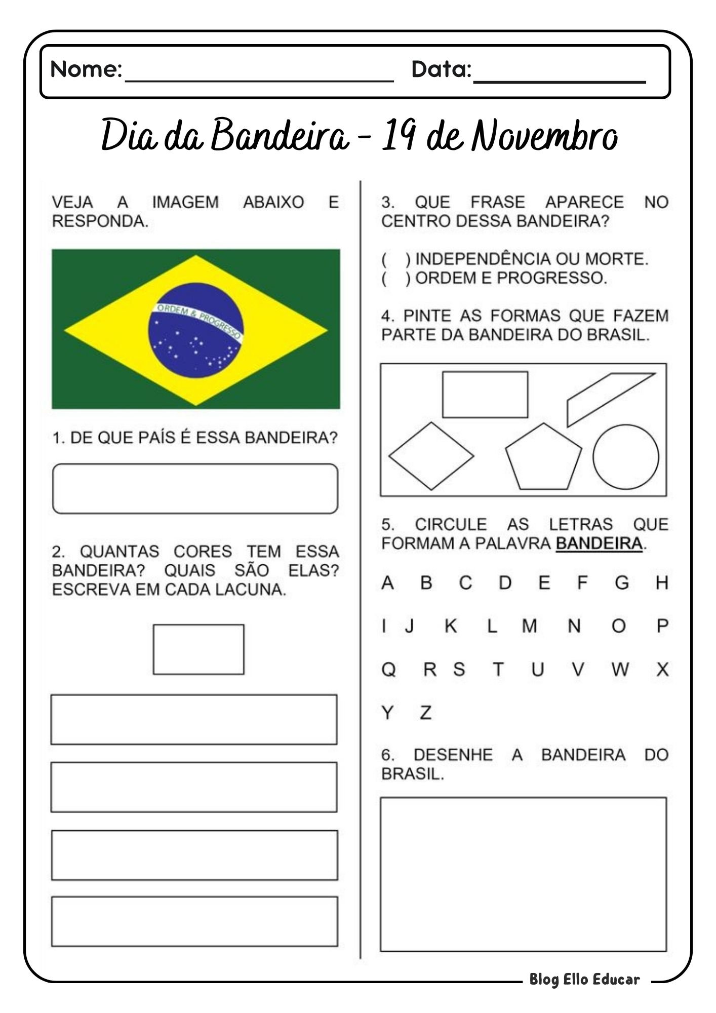 Ao trabalhar o tema, os pequenos desenvolvem o senso de pertencimento ao país, compreendem valores como paz e progresso, e praticam habilidades essenciais na fase de alfabetização.