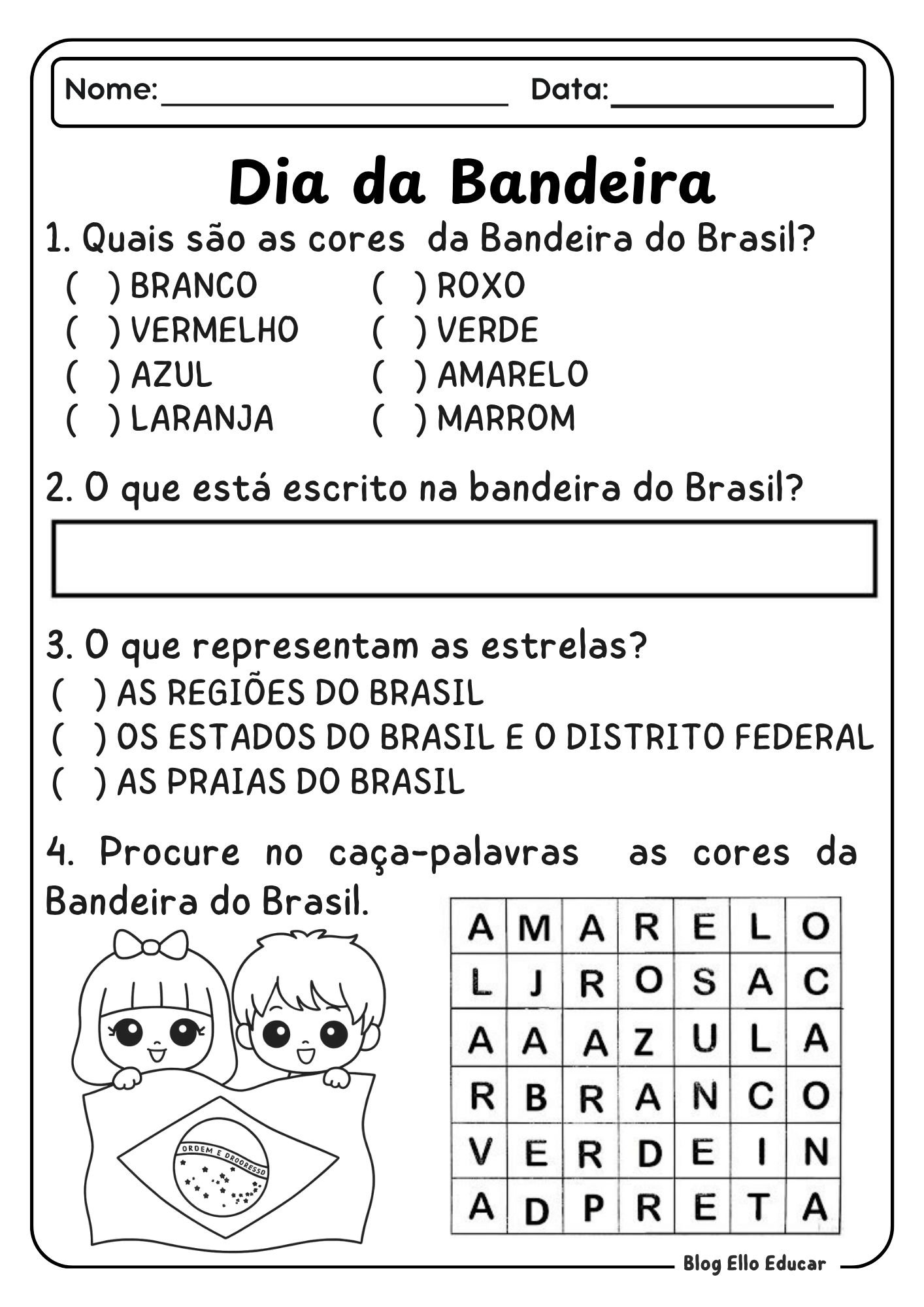 • Página 2: Múltipla escolha sobre cores + caça-palavras Identificar as cores da bandeira (branco, vermelho, azul, laranja, roxo, verde, amarelo, marrom); escrever a frase da bandeira; escolher o que as estrelas representam (regiões, estados e DF, ou praias); caça-palavras com as cores. Objetivo: Identificação de cores, vocabulário e compreensão leitora.
