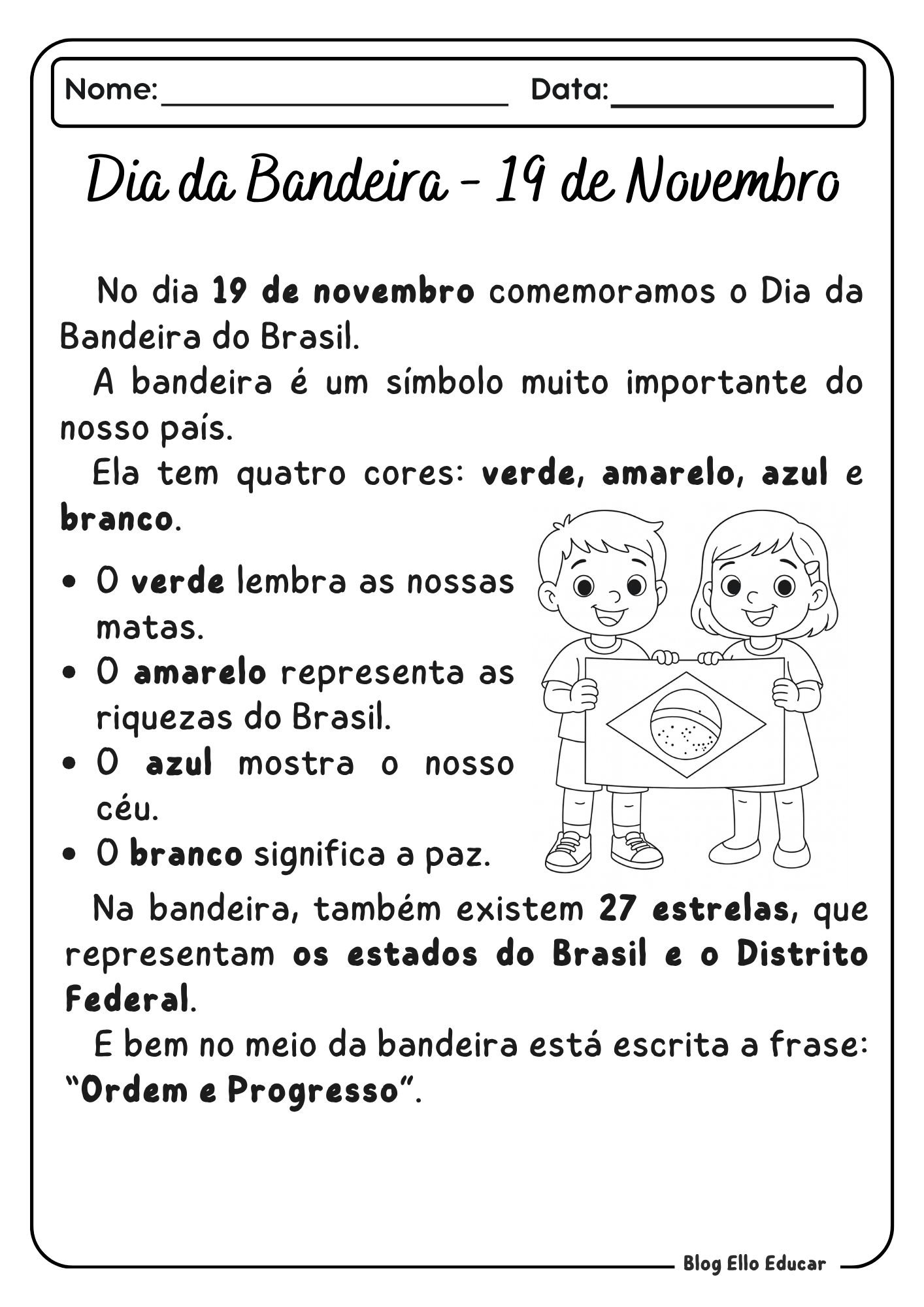 • Frase central: “Ordem e Progresso”. Ilustração de crianças com a bandeira para visualização. (Imagem: Texto explicativo sobre cores e símbolos da bandeira do Brasil)