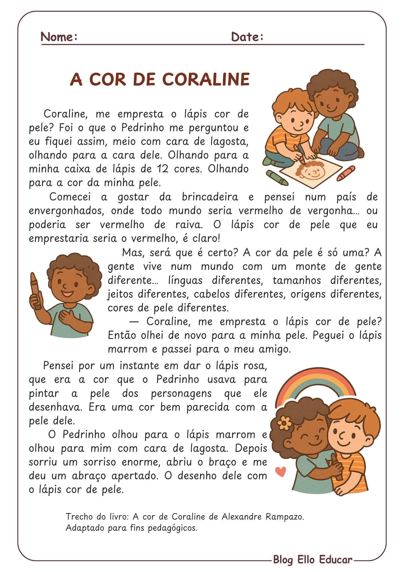 A professora Lídia Maria Sousa de Lima, pedagoga e psicopedagoga, criou este recurso pensando no 3º ano do Ensino Fundamental. O texto “A Cor de Coraline” aborda o racismo sutil de forma delicada: quando Pedrinho pede o “lápis cor de pele”, Coraline reflete e entrega o lápis marrom, sua própria cor, e os dois se abraçam. É perfeito para o Dia da Consciência Negra (20 de novembro) ou para qualquer momento de discussão sobre identidade e respeito.