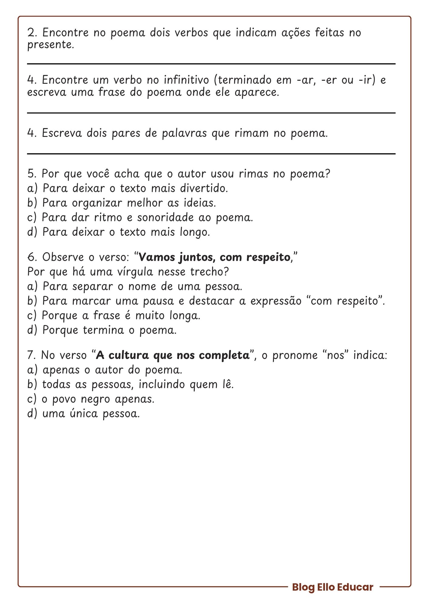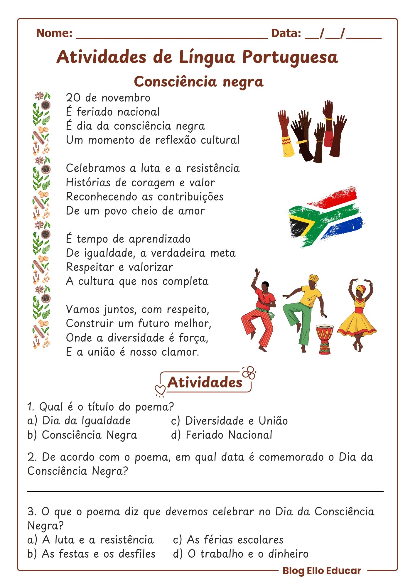 Você procura atividades sobre o Dia da Consciência Negra 4° e 5° ano que sejam significativas, alinhadas à BNCC e prontas para imprimir? O Blog Ello Educar preparou um pacote completo de Língua Portuguesa que trabalha o tema de forma sensível e integrada. O material contém um belo poema inédito, 17 questões de interpretação de texto e gramática, além do gabarito completo para facilitar sua correção. Tudo gratuito e em PDF de alta qualidade!