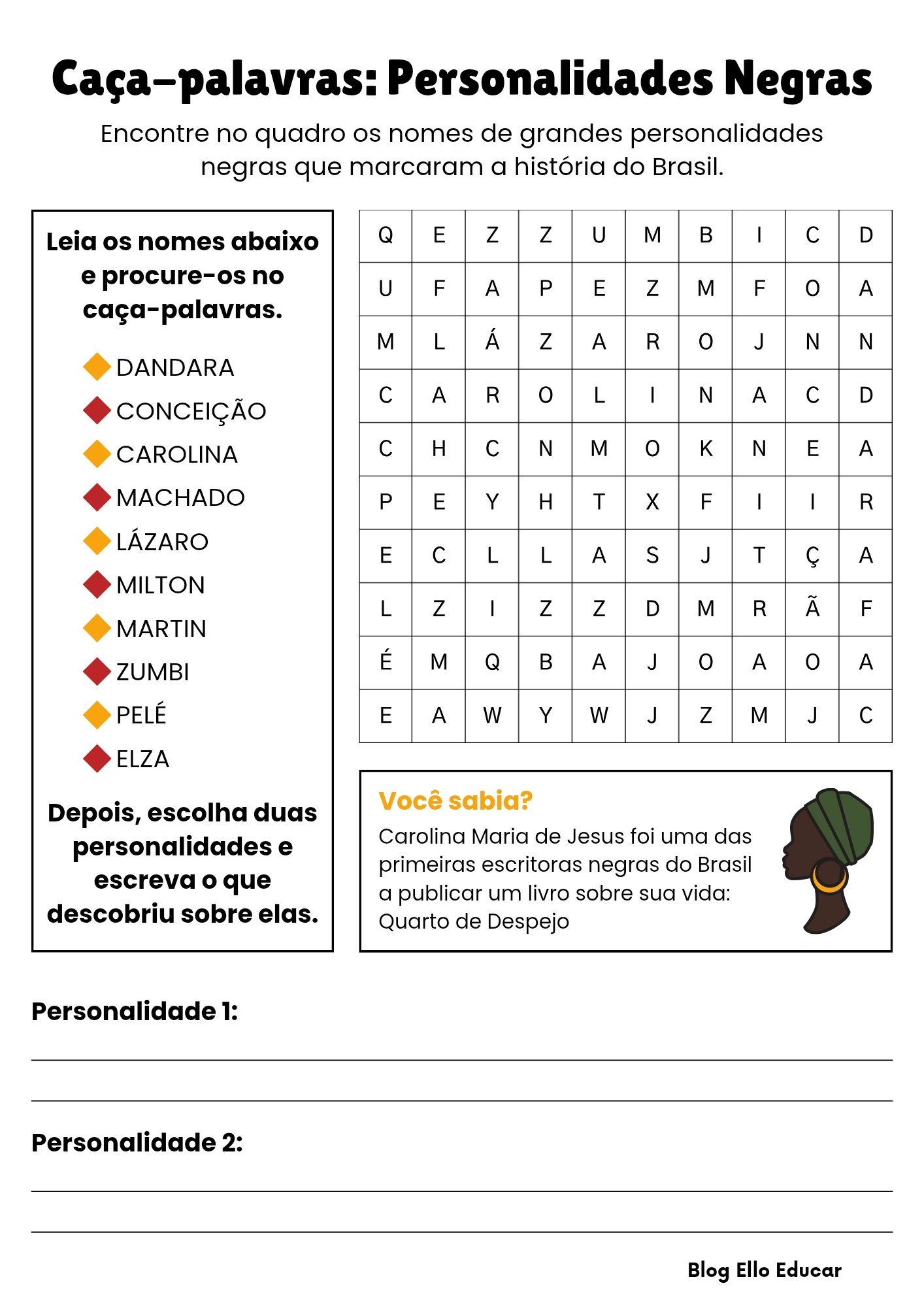 Esta atividade lúdica e engajadora permite aos alunos conhecer e memorizar nomes importantes da história negra brasileira e mundial.