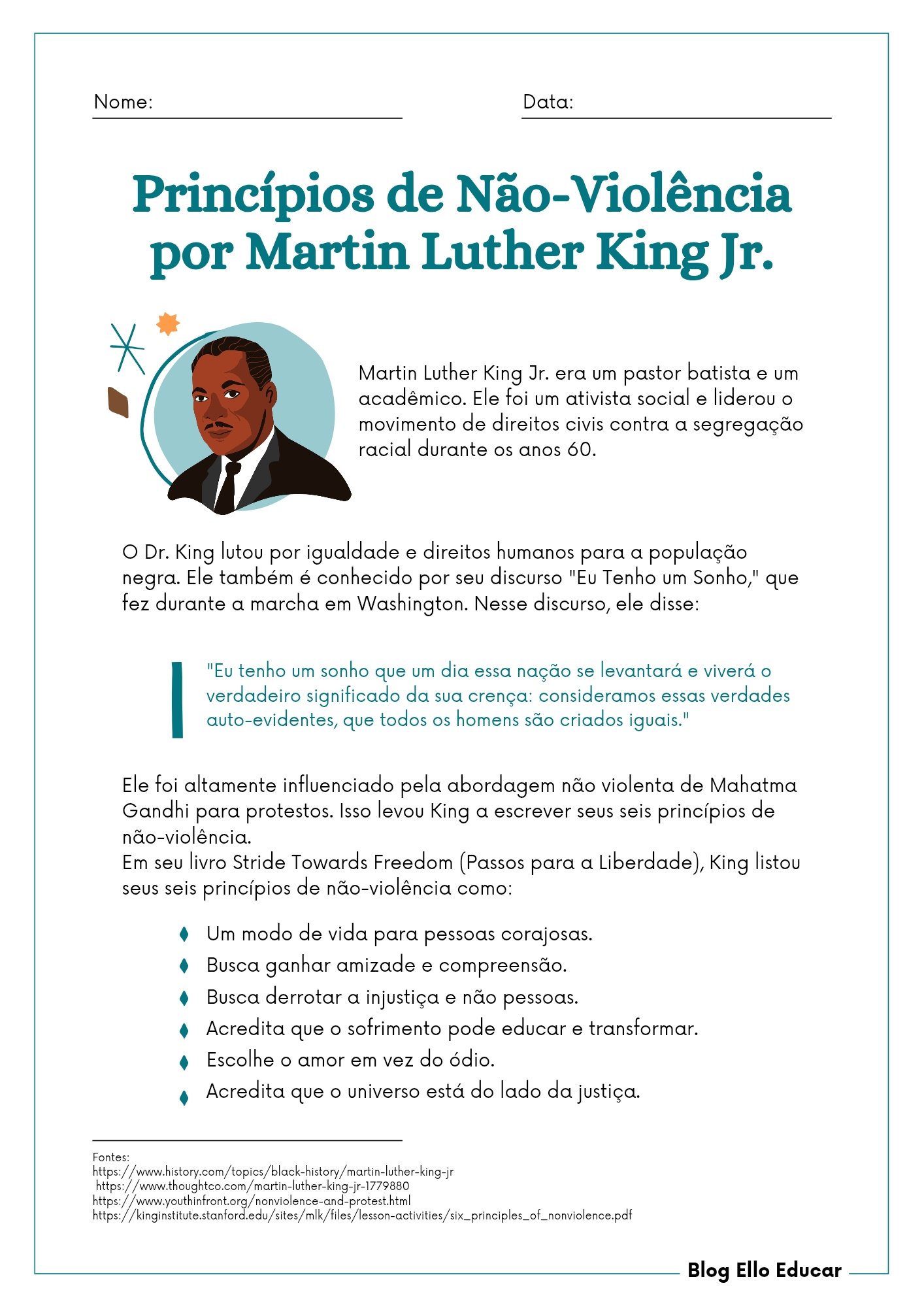 • A atividade apresenta a biografia de Martin Luther King Jr., pastor, ativista social e líder do movimento de direitos civis nos anos 60, nos EUA.
