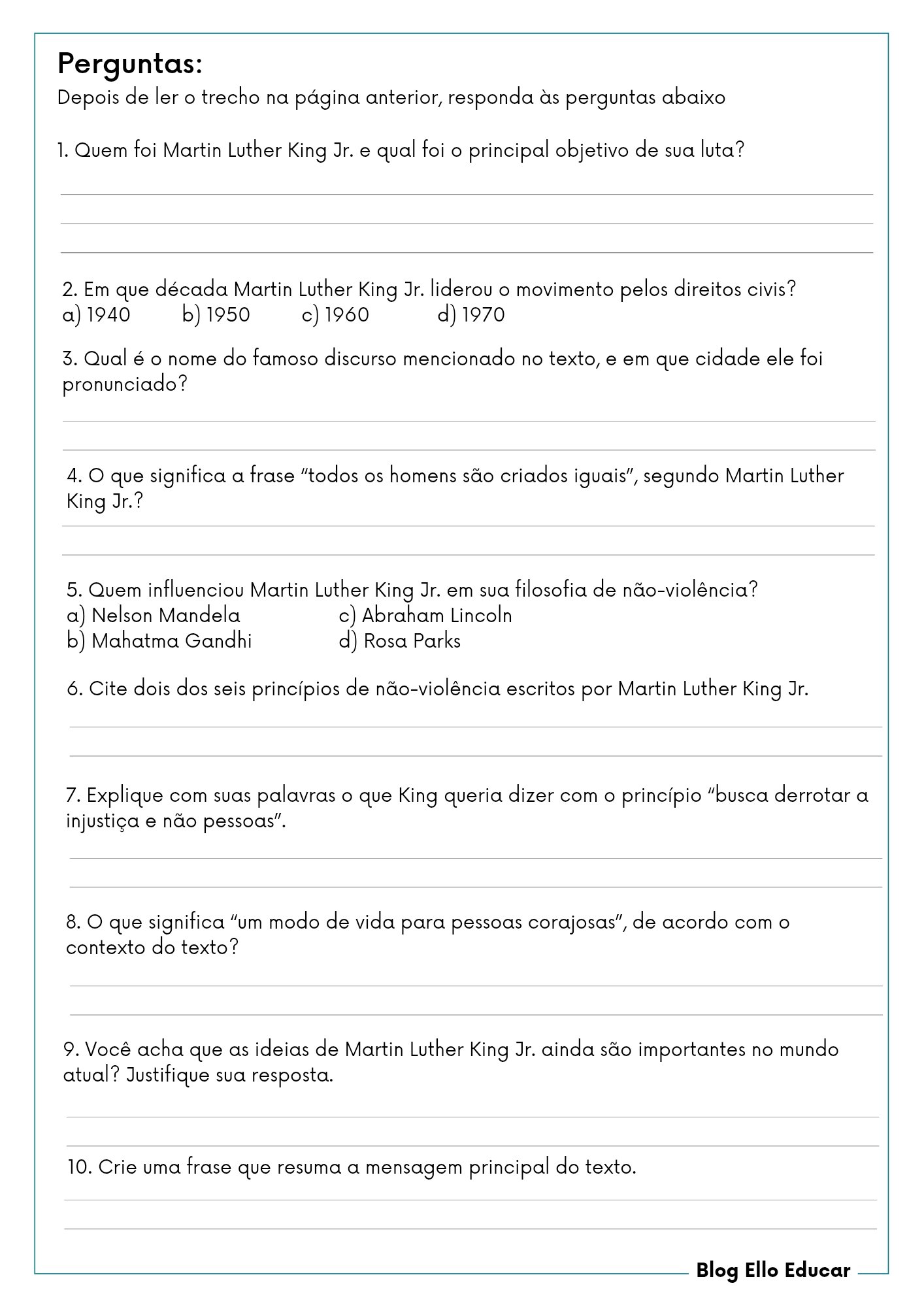 • As questões desafiam os alunos a explicar os princípios com suas palavras e a refletir sobre a relevância das ideias de King no mundo atual.