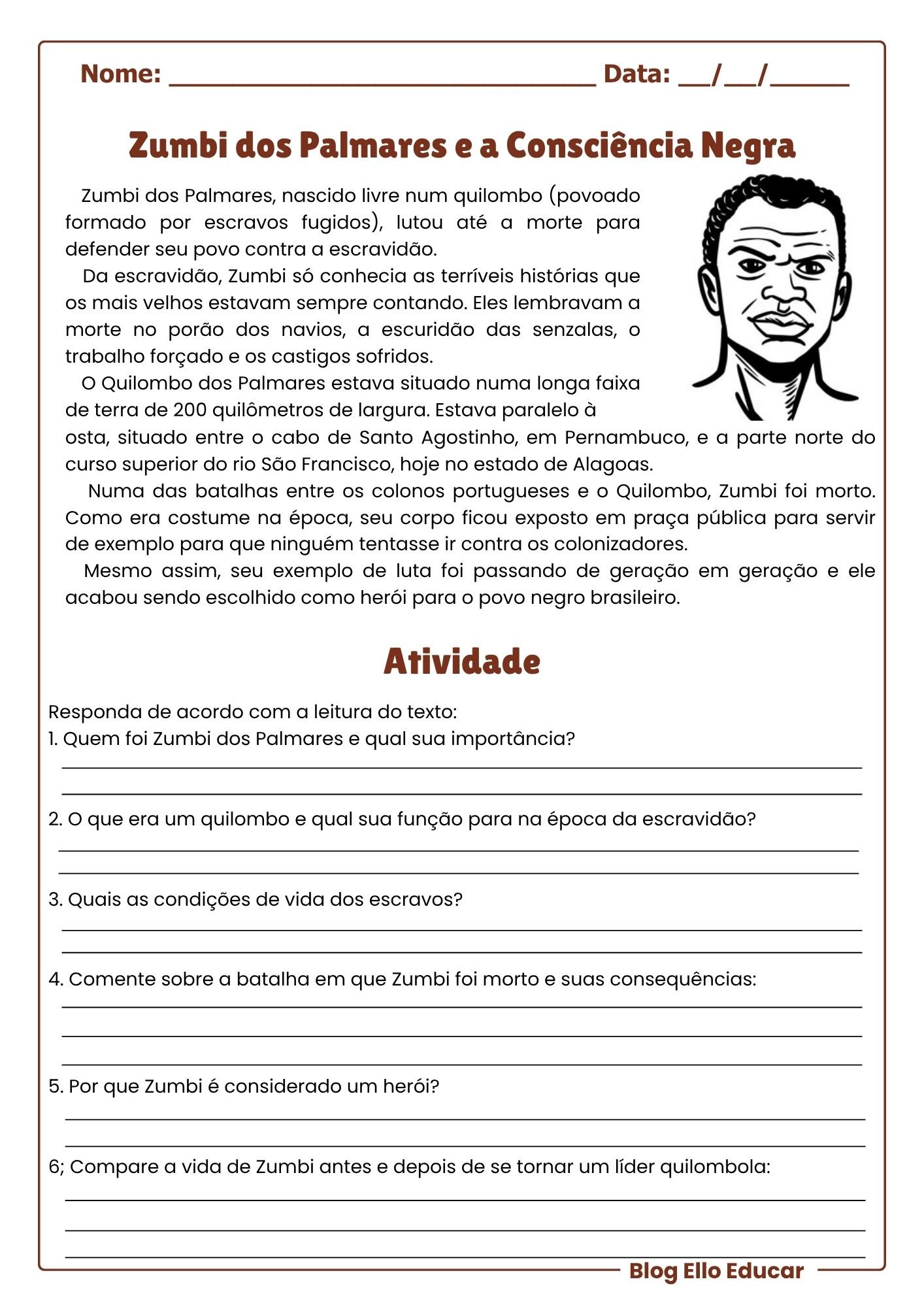 • A atividade conta com um texto narrativo sobre Zumbi dos Palmares, destacando seu nascimento livre no quilombo e sua luta incansável contra a escravidão.