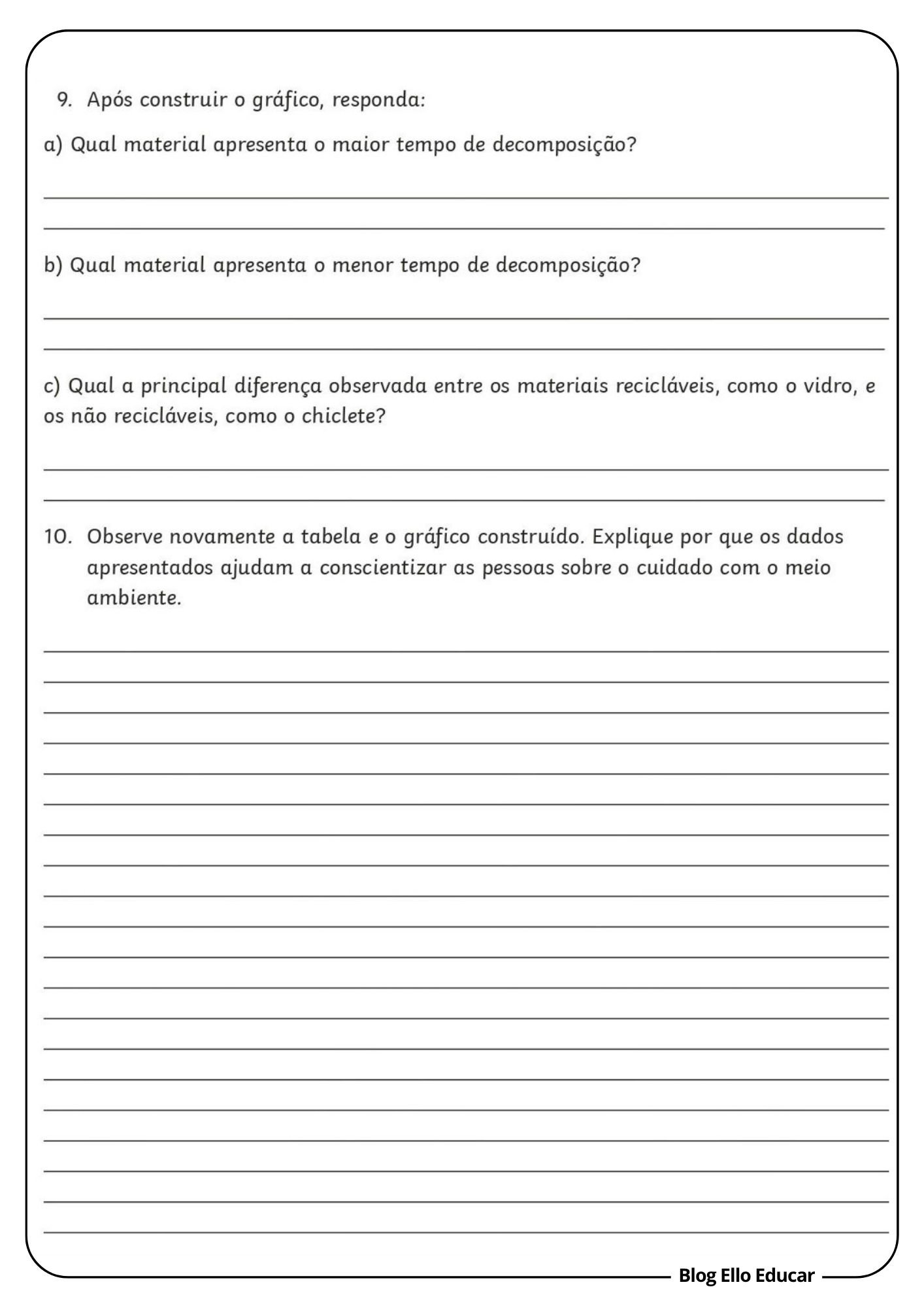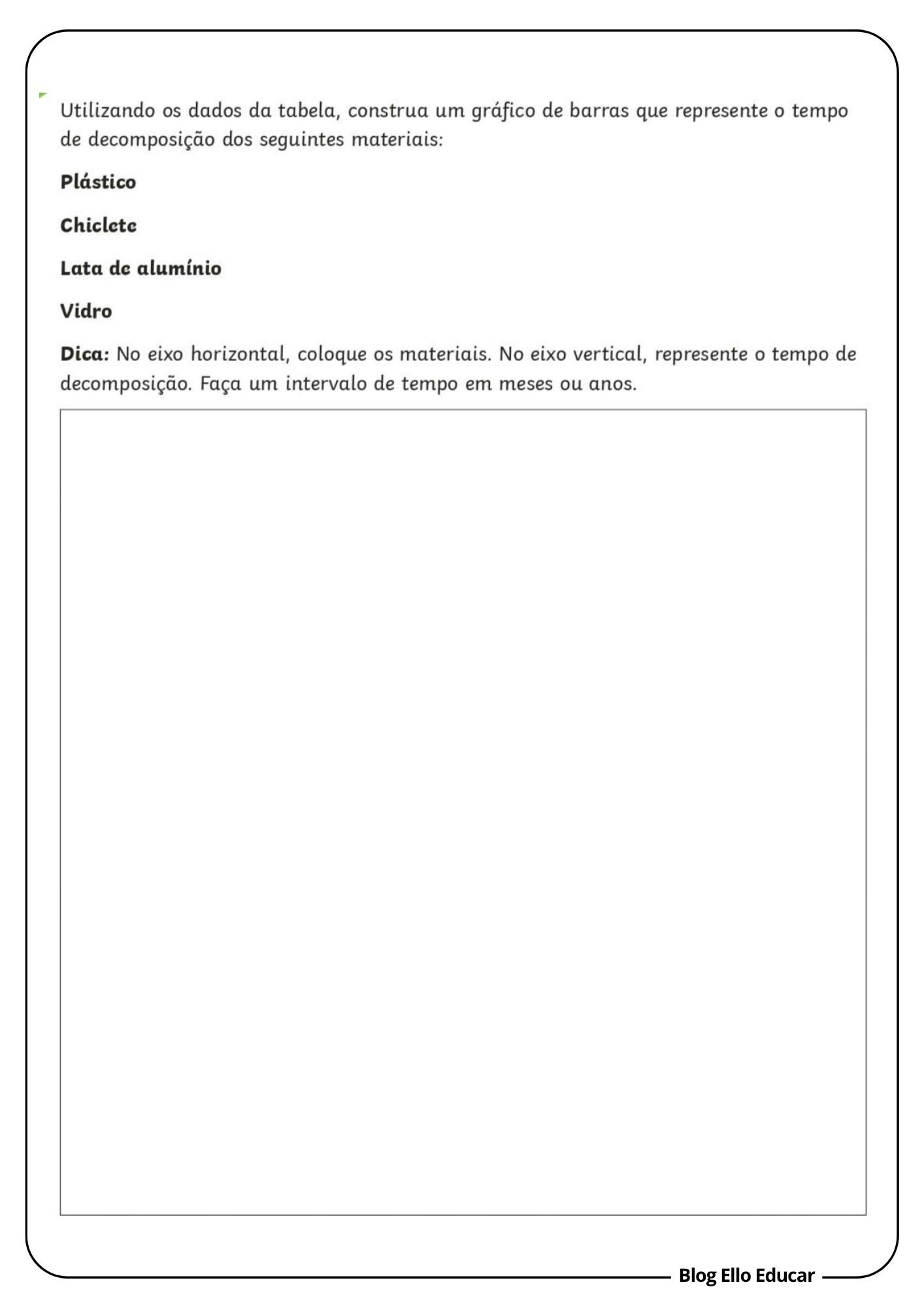 • Tabela com tempo de decomposição de materiais (papel, plástico, vidro, etc.)