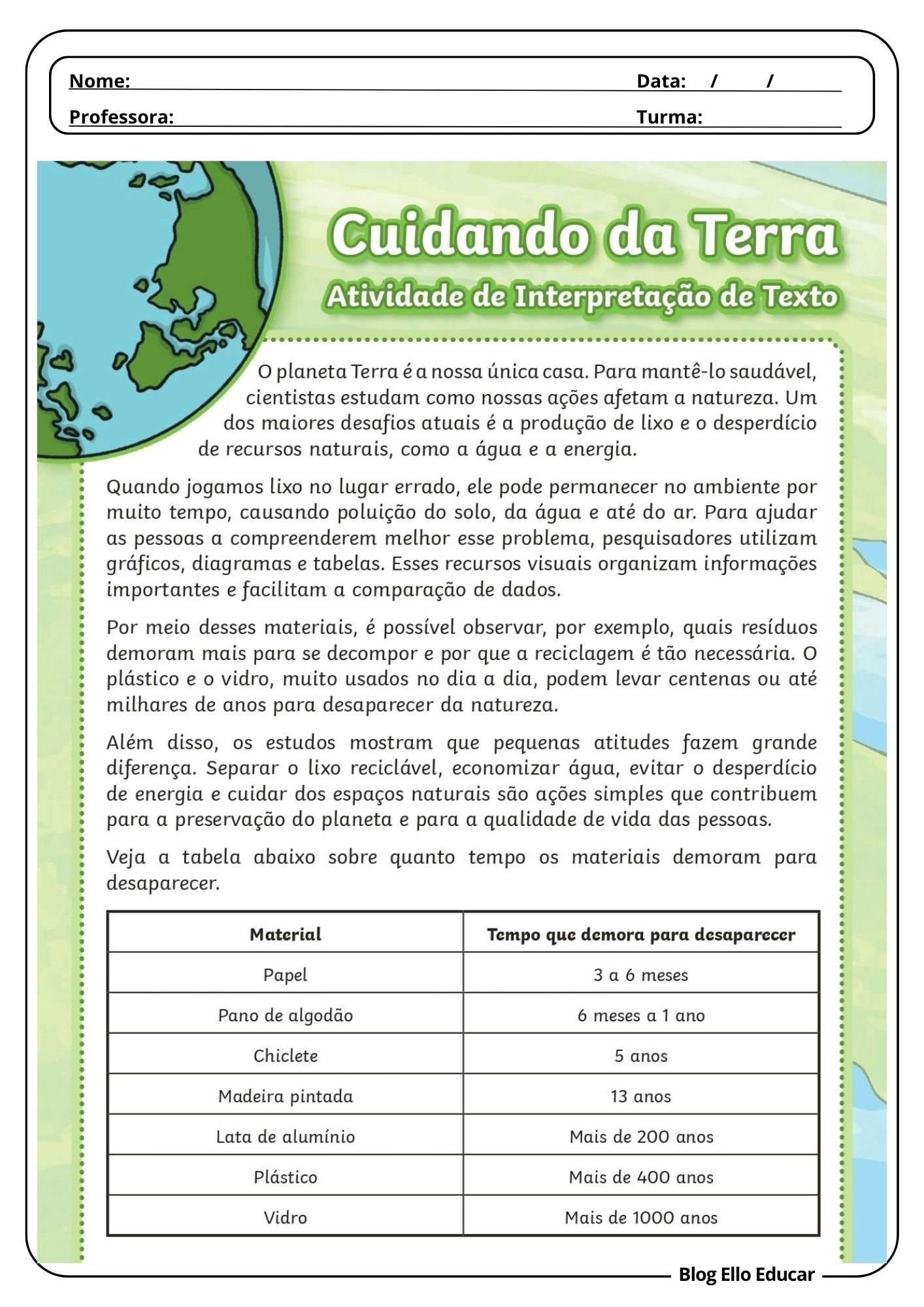 Atividades sobre o dia da Terra – 4° e 5° ano