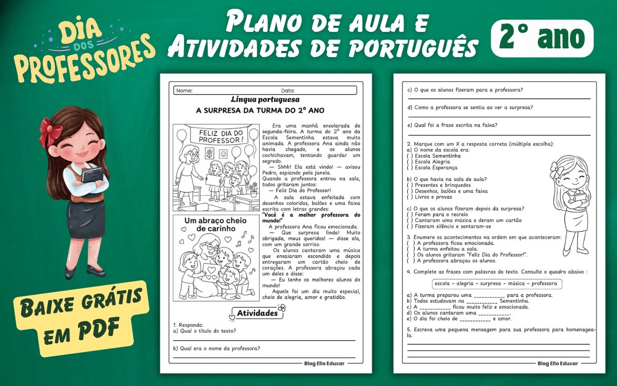 Professores enfrentam diariamente o desafio de criar aulas que motivem os alunos e atendam às exigências da Base Nacional Comum Curricular (BNCC). Muitos buscam recursos prontos que combinem aprendizado com temas significativos, como o Dia do Professor. O Ello Educar oferece exatamente isso: atividades do dia do professor 2° ano em Língua Portuguesa, disponíveis para download gratuito. Esse material inclui um texto envolvente sobre uma surpresa para a professora, seguido de exercícios que desenvolvem habilidades essenciais. Além disso, preparamos um plano de aula completo e alinhado à BNCC, que integra emoção, homenagem e educação de forma equilibrada. Os alunos se engajam enquanto aprimoram leitura, interpretação e vocabulário.