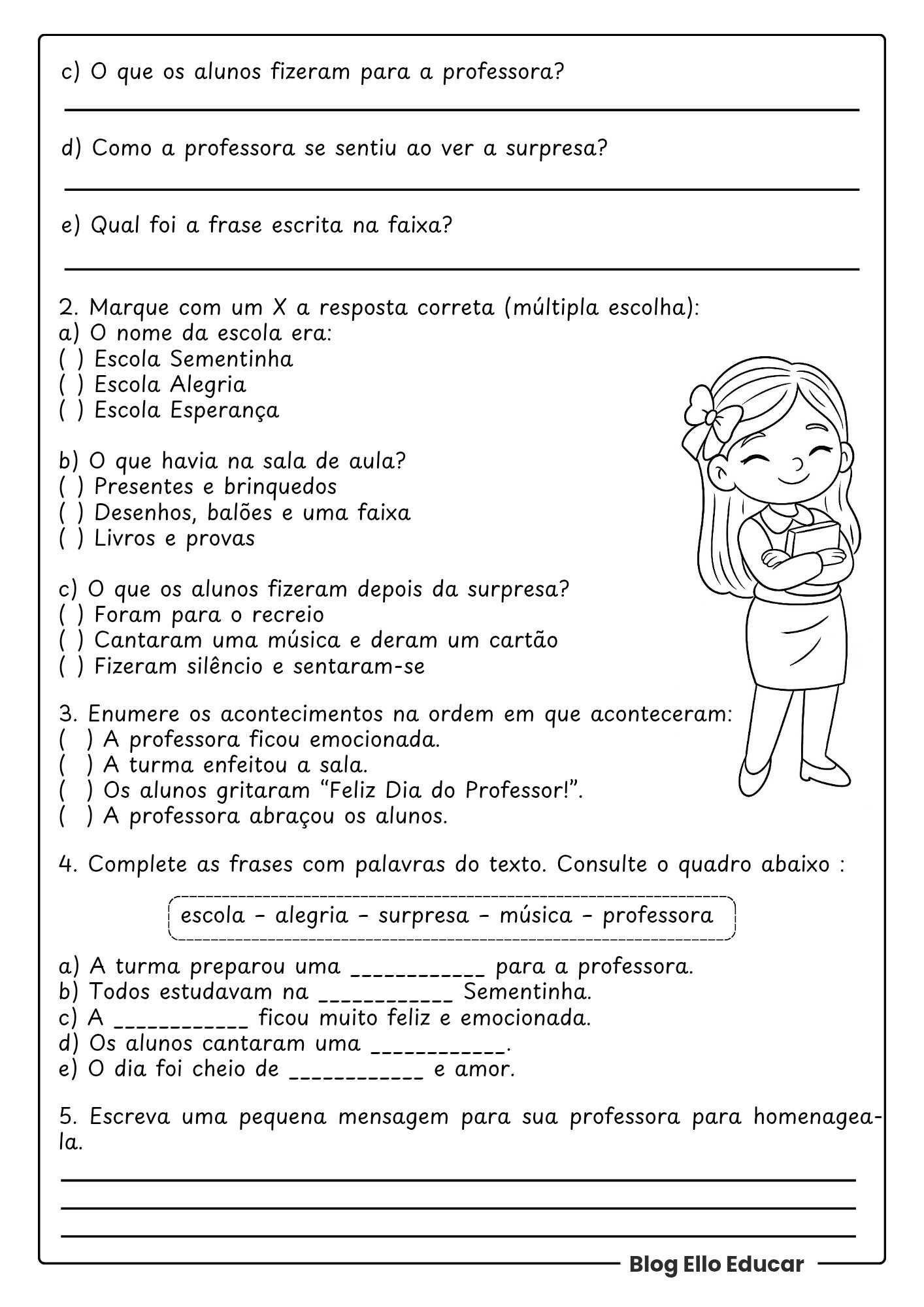 - Sequência de eventos: Um exercício de enumeração ordena os acontecimentos – turma enfeita a sala, alunos gritam a saudação, professora fica emocionada, professora abraça os alunos – para trabalhar coerência narrativa e lógica temporal.