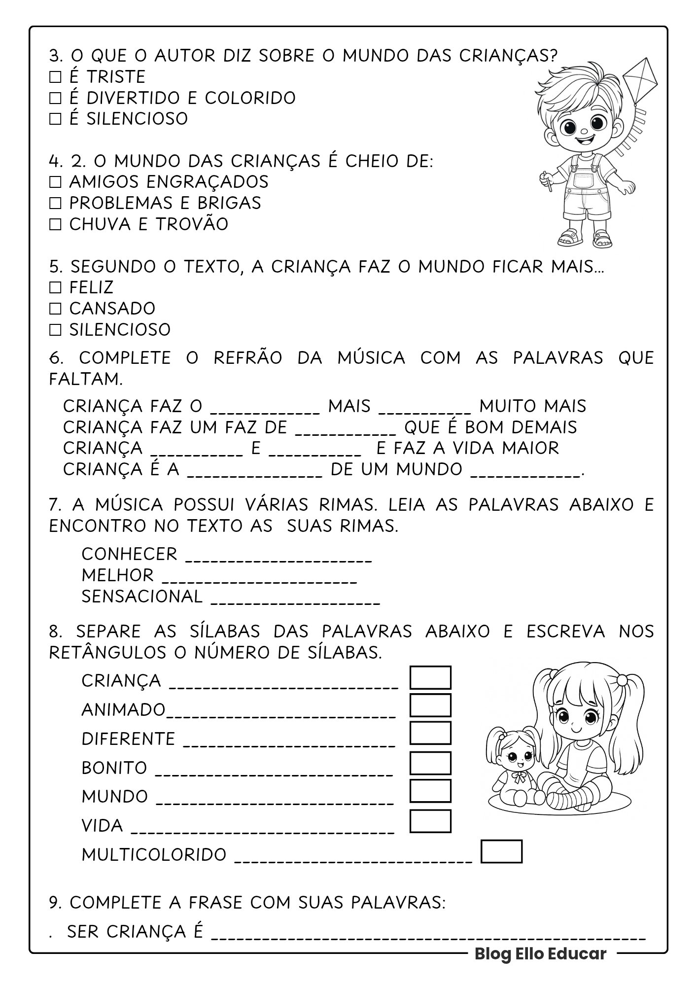 - Foco em Língua Portuguesa: Trabalha interpretação da música “Mundo das Crianças” do Bob Zoom, separação de sílabas, rimas e múltipla escolha sobre temas como diversão e amizade.