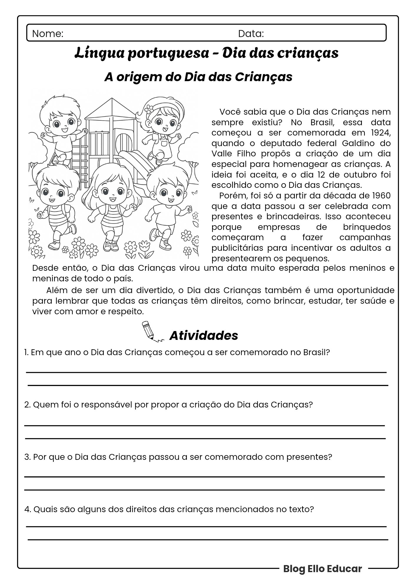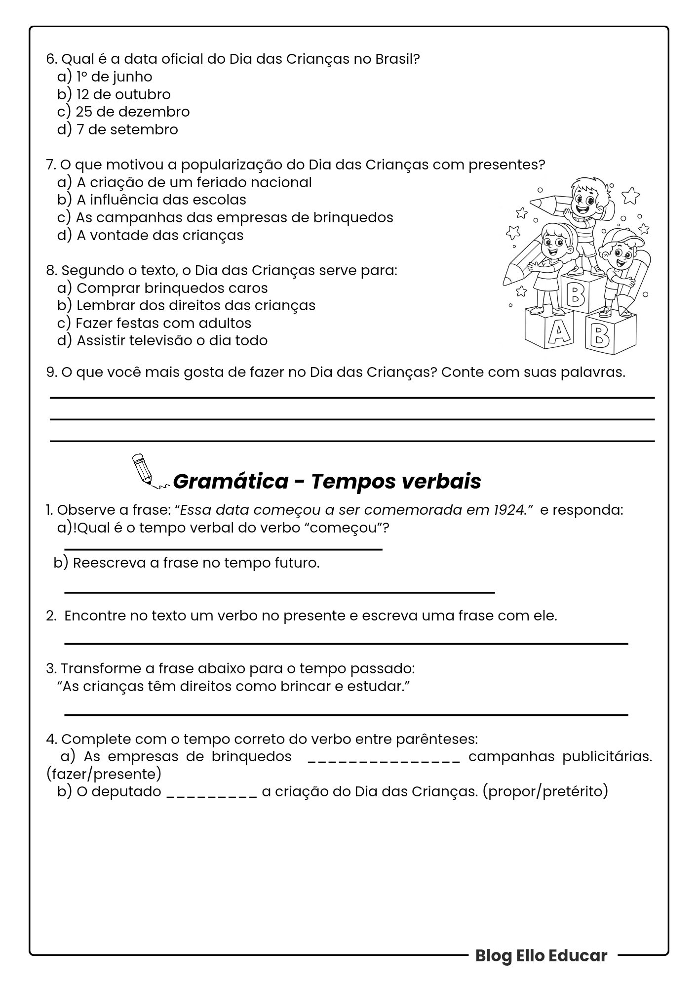 • Conteúdo: Texto sobre a origem da data, direitos das crianças, exercícios de interpretação e gramática (tempos verbais).