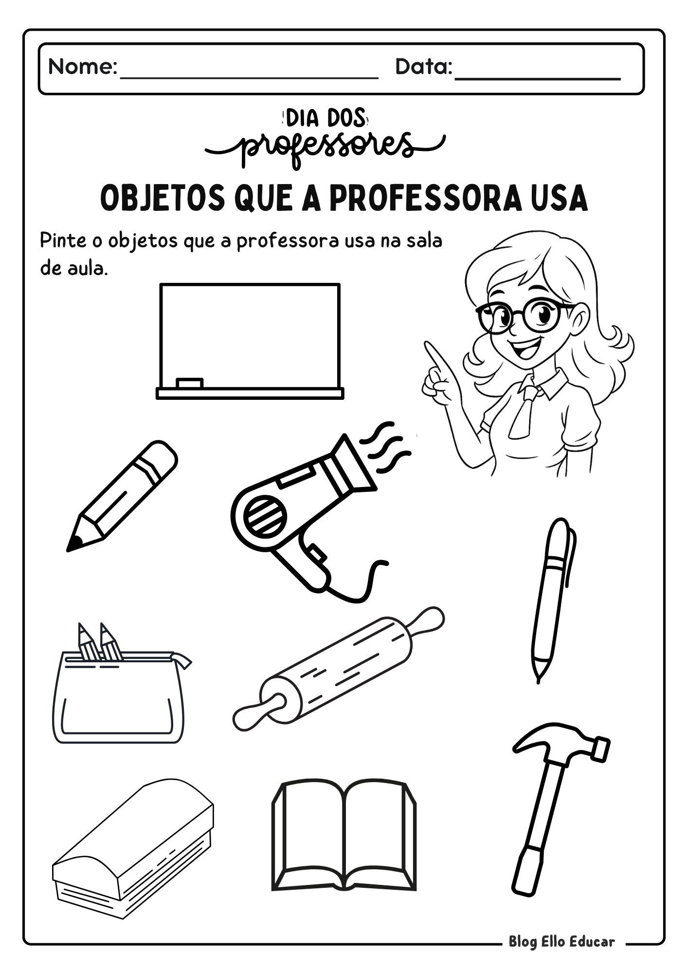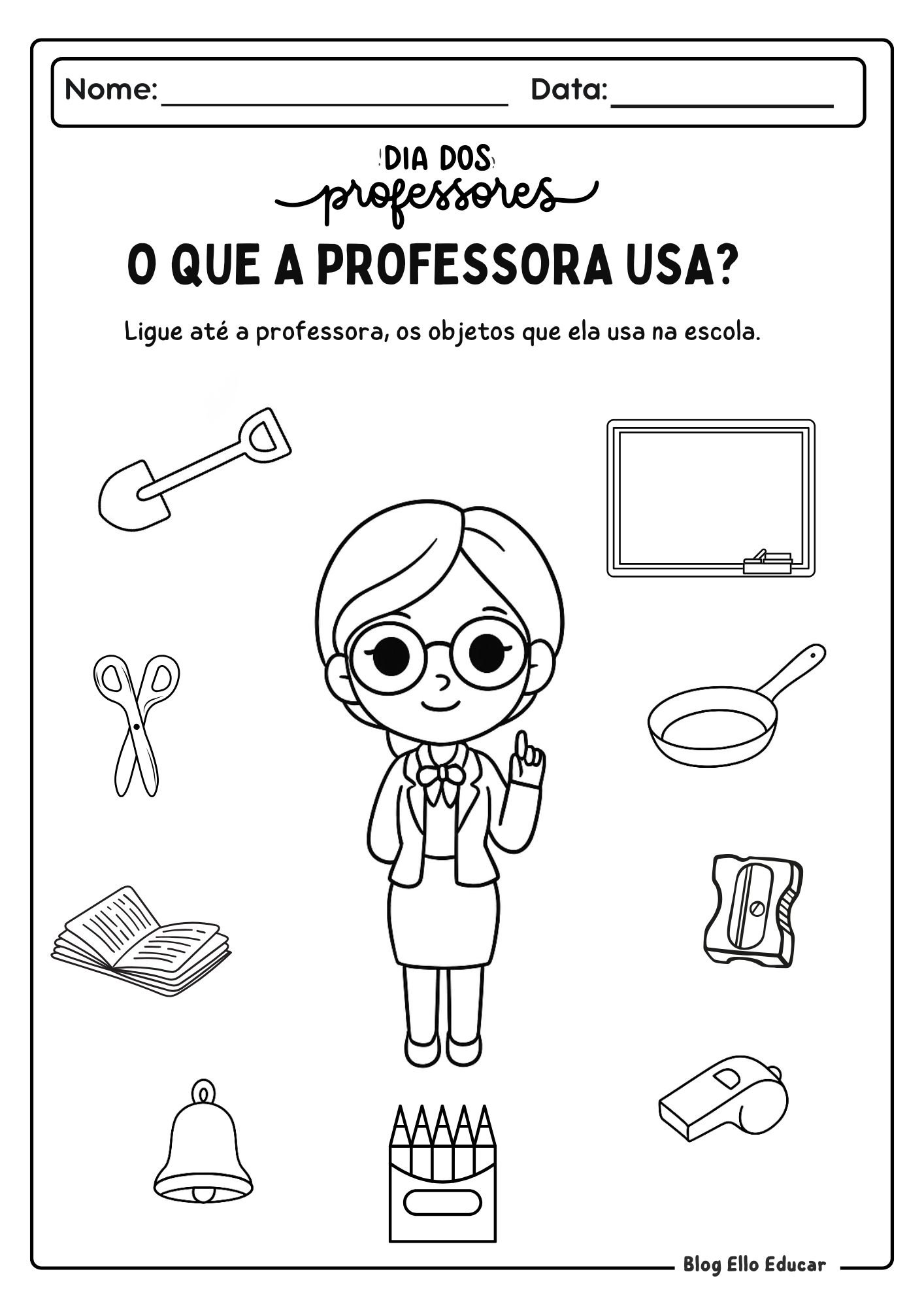 - As crianças pintam e ligam objetos do cotidiano escolar à figura da professora.