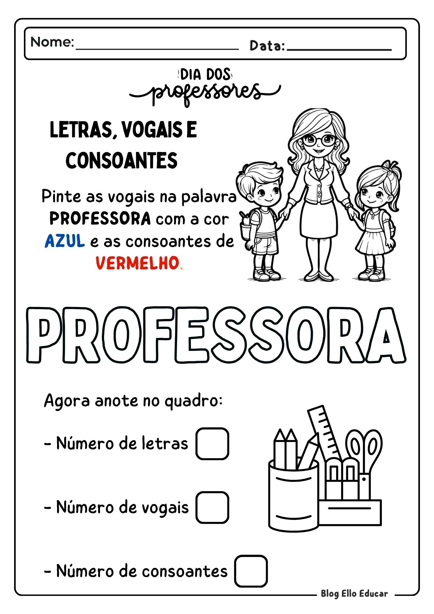 O material é 100% gratuito e foi desenvolvido com muito carinho para apoiar o trabalho docente. No mesmo espaço, você encontrará outras atividades para o Dia dos Professores, além de desenhos para colorir.
