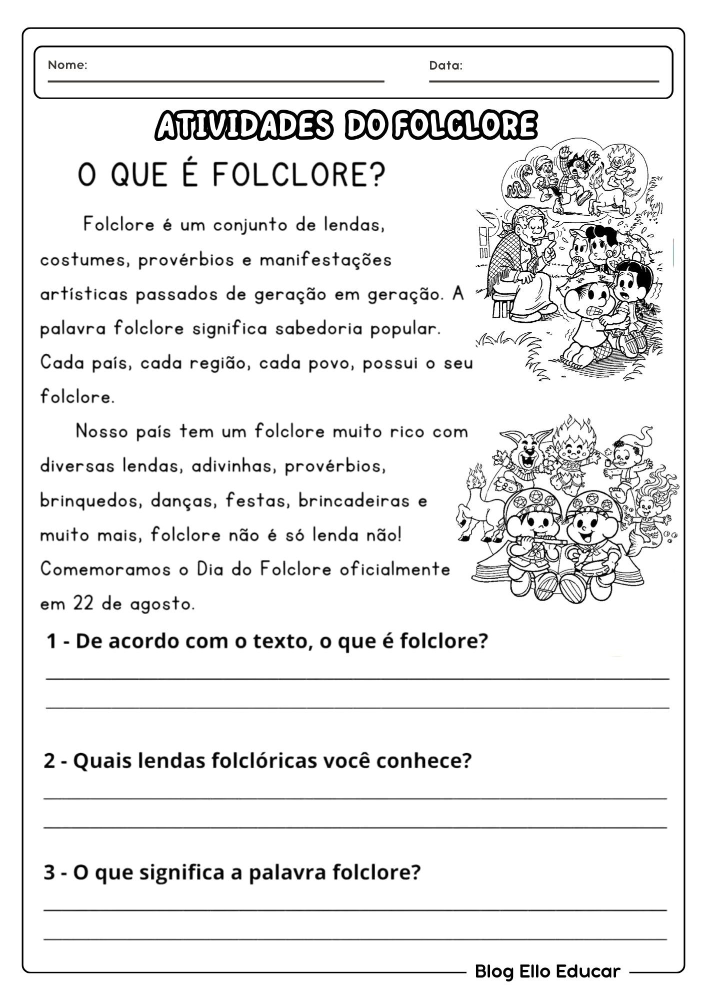 Esta atividade conceitual explica o que é o folclore, definindo-o como um conjunto de lendas, costumes e provérbios transmitidos entre gerações. O texto também menciona que a palavra “folclore” significa “sabedoria popular”.