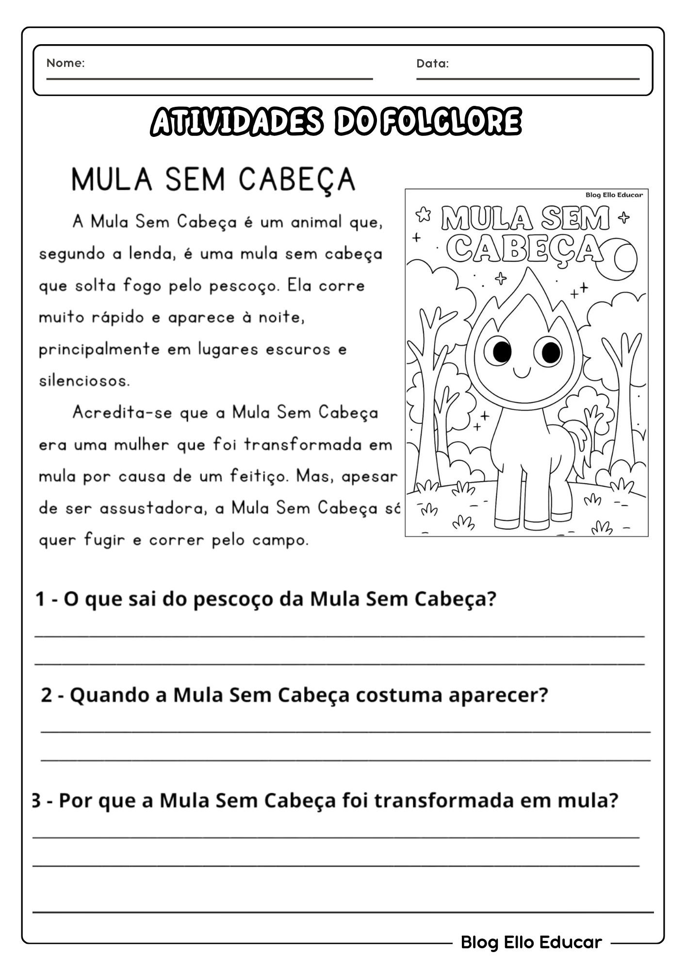 A lenda da Mula sem Cabeça conta a história de uma mulher que foi transformada em uma mula que solta fogo pelo pescoço. O texto da atividade detalha quando ela aparece e o que ela faz.