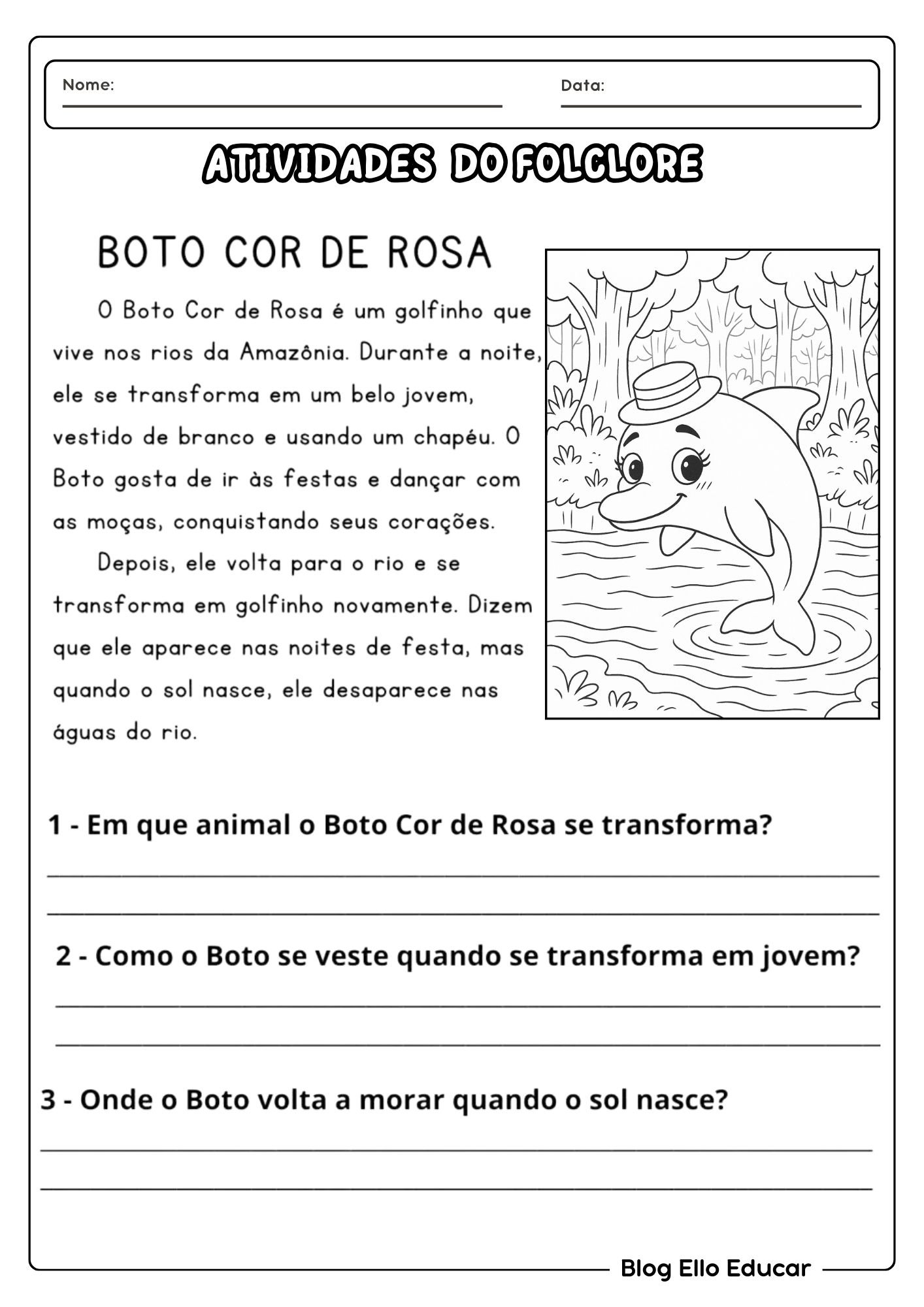 O Boto-cor-de-rosa é um golfinho que vive nos rios da Amazônia. À noite, ele se transforma em um rapaz elegante de chapéu branco para ir a festas. Esta atividade explora essa lenda e as características do personagem.