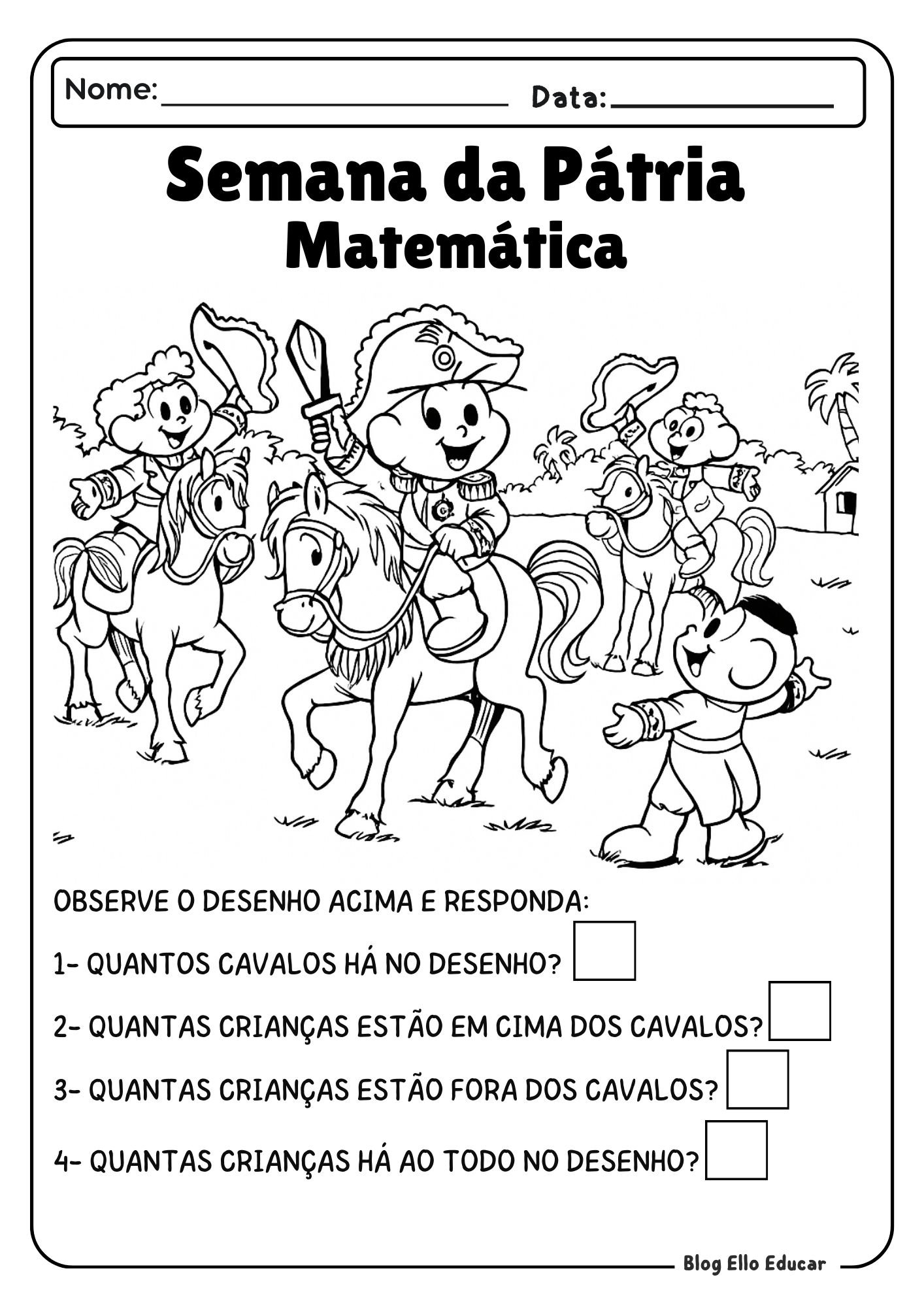 A seção de Matemática da apostila utiliza o tema da Independência do Brasil para trabalhar conceitos numéricos de forma prática e divertida. Os exercícios de contagem, por exemplo, solicitam que as crianças identifiquem a quantidade de cavalos e pessoas em ilustrações, ajudando a desenvolver o raciocínio lógico e a associação entre número e quantidade.