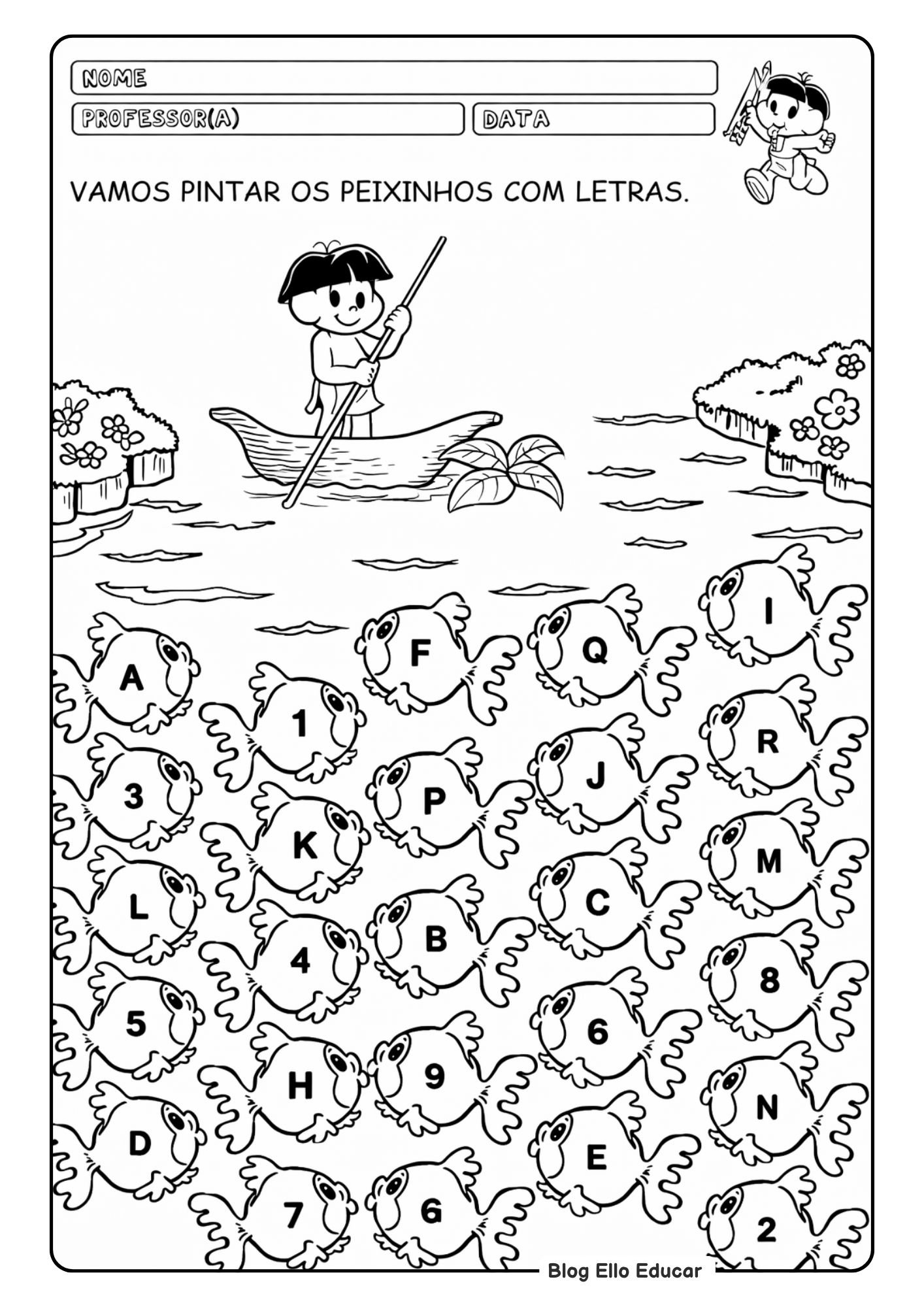 - Descrição: Atividades com letras, identificação do nome e reconhecimento de vogais (como pintar letras do nome ou selecionar vogais nos peixinhos).