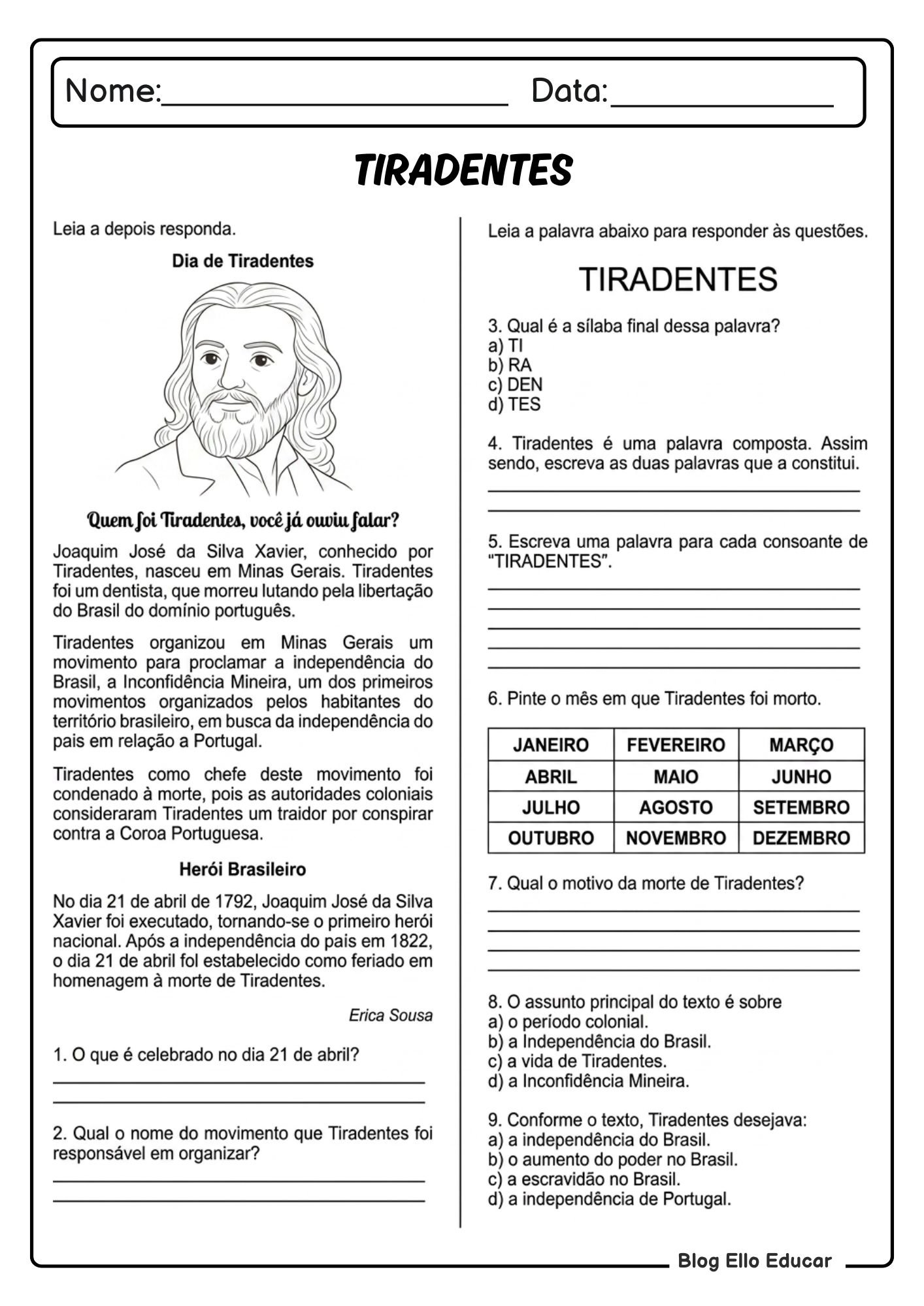O Blog Ello Educar reafirma seu compromisso em oferecer materiais educativos de qualidade, como estas Atividades sobre Tiradentes para 1° ano, que auxiliam professores na construção de aulas mais dinâmicas, significativas e alinhadas à BNCC.