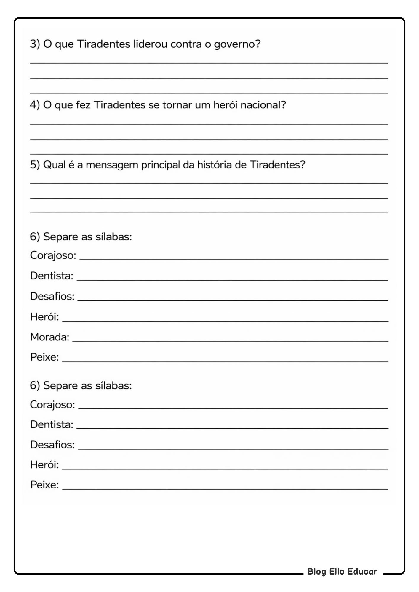 O Blog Ello Educar reafirma seu compromisso em oferecer materiais educativos de qualidade, como estas Atividades sobre Tiradentes para 3° ano, que contribuem diretamente para aulas mais dinâmicas, organizadas e significativas.