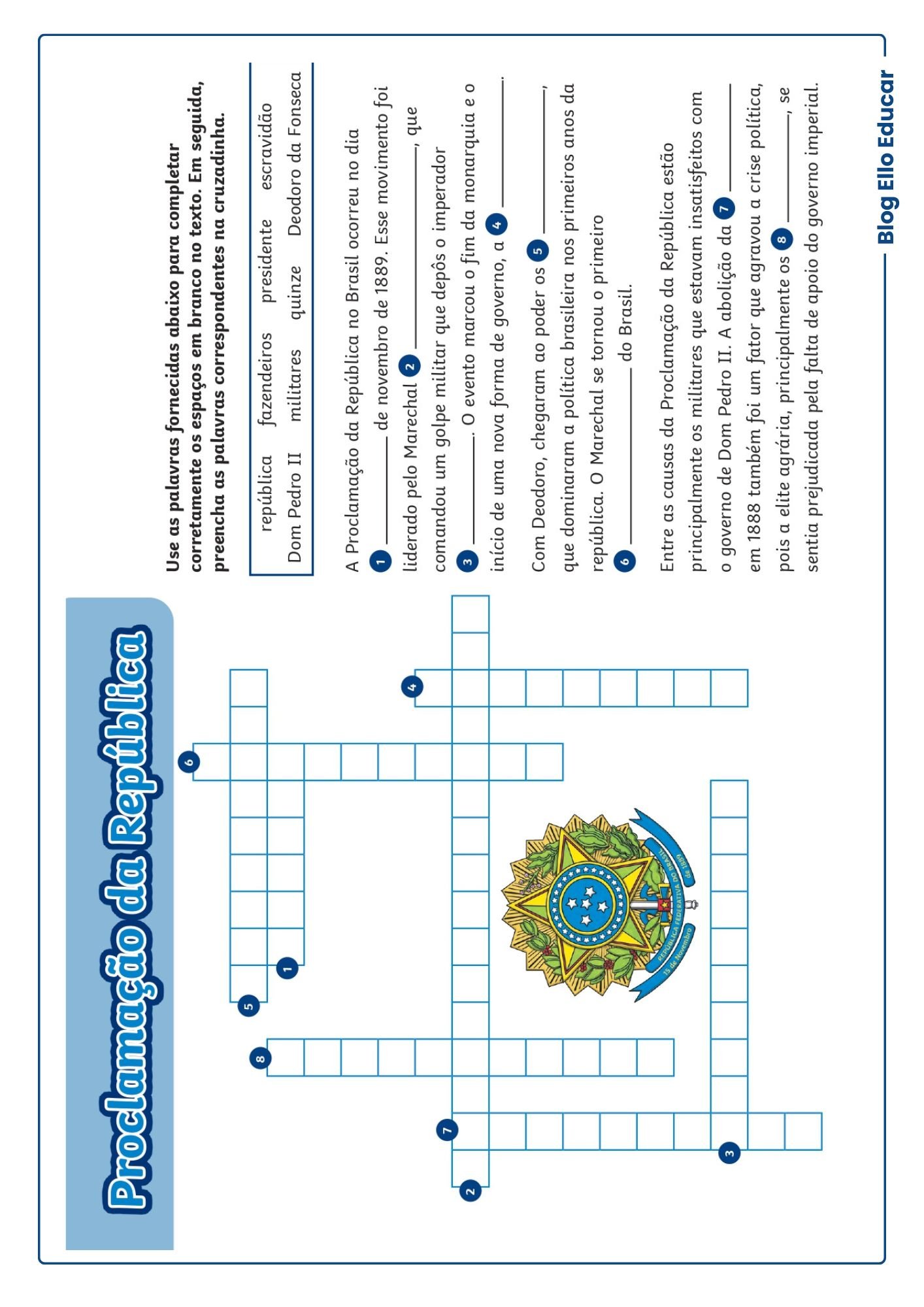 A cruzadinha ocupa uma página colorida com o brasão da República ao centro, criando um visual atrativo para os alunos. São 9 pistas (horizontais e verticais) que abordam fatos históricos essenciais do 15 de novembro de 1889.