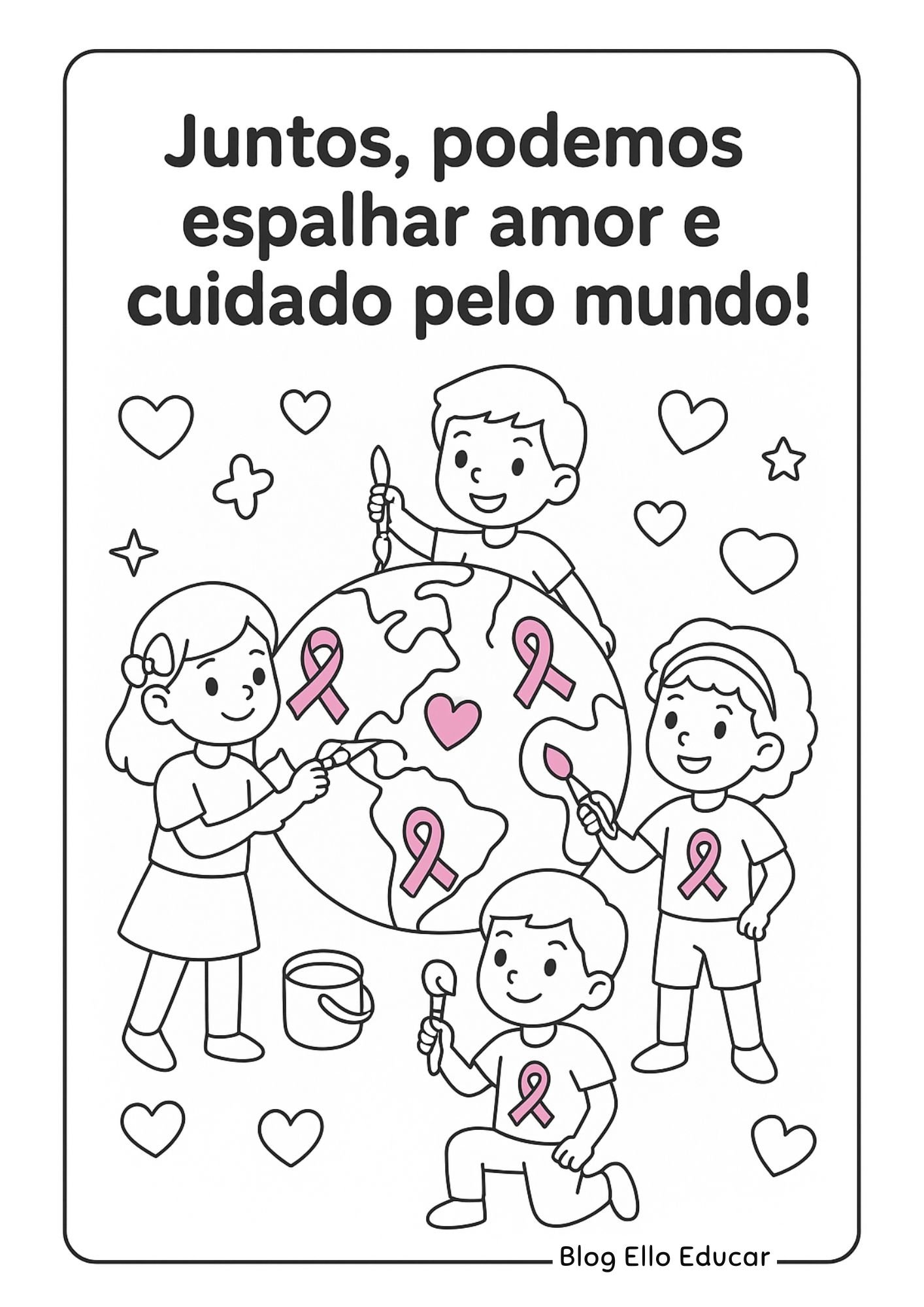 - Espalhando amor e cuidado pelo mundo: Desenho de crianças pintando a fita rosa no globo terrestre.