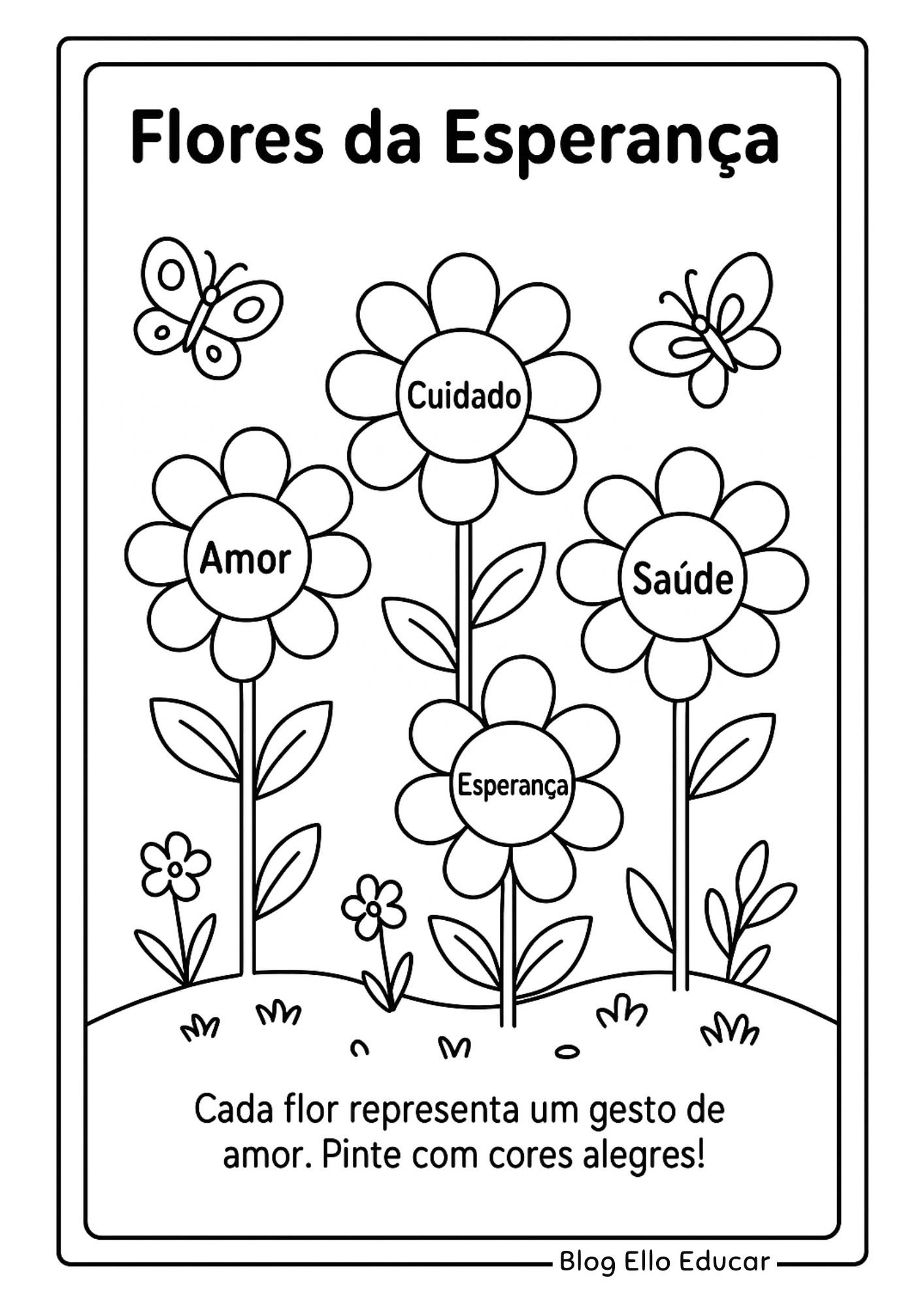 - Jardim de laços: Atividade para pintar laços que representam flores em um jardim e com mensagem de saúde e esperança.