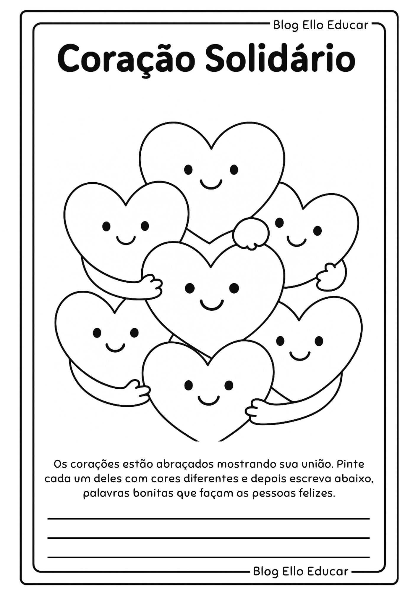 - Corações abraçados: Atividade para pintar corações e escrever palavras que façam as pessoas felizes.