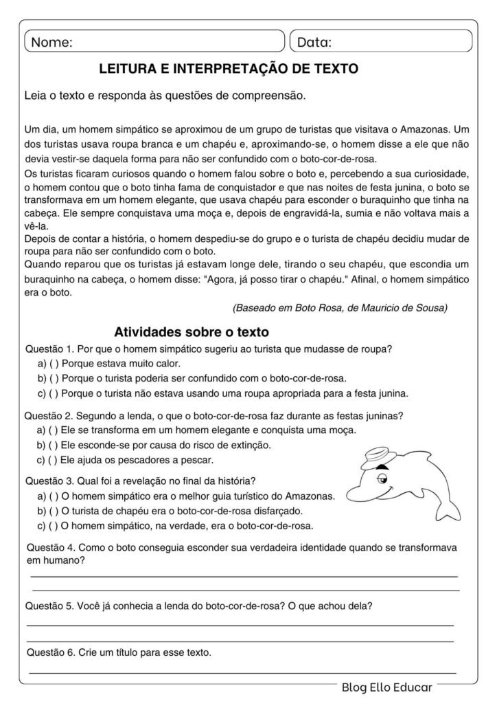 • Aula 2 (50 minutos): Corrija as respostas das questões de interpretação em grupo, promovendo uma discussão sobre a lenda. Apresente um mapa do Brasil para localizar a região da Amazônia, onde a lenda é mais forte. Assista a um vídeo curto sobre o boto cor-de-rosa, o animal, para contextualizar. Finalize a aula com uma atividade de produção textual, onde cada aluno cria um final diferente para a história ou um desenho do personagem principal.