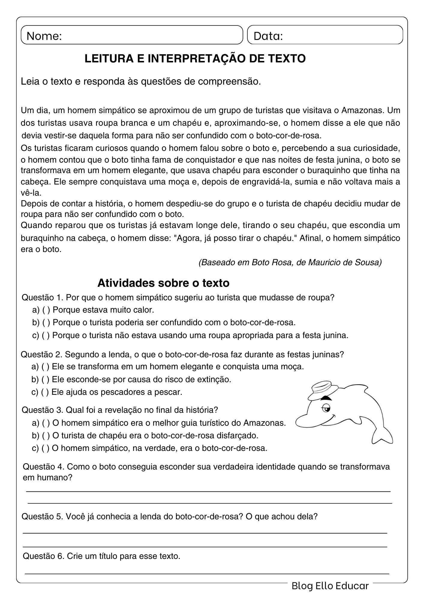 Leitura e interpretação Boto-cor-de-rosa 4° ano